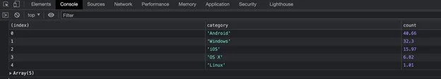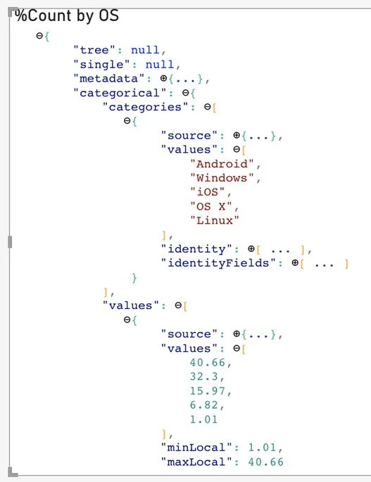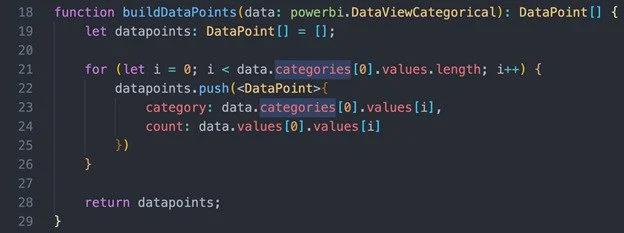 We have used categorical dataView, so the “categorical” property will contain the data. The “categories” property has category value and the “values” property contains the measure data.