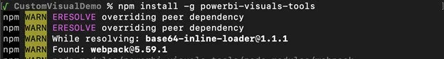 1. Run the “npm install -g powerbi-visuals-tools” command to install the pbiviz library.