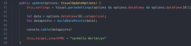 When the update method is called, we need to re-render the visual. The update method has an argument “options” which contains the properties like dataView, viewport, etc. The dataView property will contain the actual data which you can use for visualization. And the viewport property will contain the height and width of the visual.